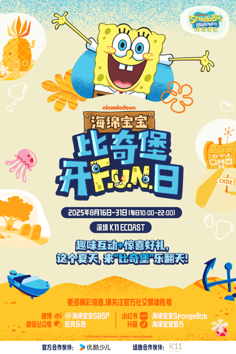 中国深圳,8月16日 —— 尼克乐恩(Nickelodeon)旗下深受全球粉丝喜爱的动画剧集《海绵宝宝》再度掀起欢乐浪潮,即日起至8月31日,首场“海绵宝宝比奇堡开F.U.N.日”盛大登陆深圳K11 ECOAST。以经典比奇堡地标打造沉浸式狂欢派对,带领游客走进欢笑满满又无厘头的海绵宝宝世界,收获独特的夏日回忆。